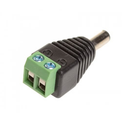 Conector para alimentação de fonte de câmeras de CFTV tipo borne com 2 parafusos para cabos de pares.
